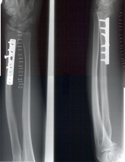 I was recently sideswiped by a truck on my bicycle and broke my arm. Here's the x-ray of my arm and bolts.